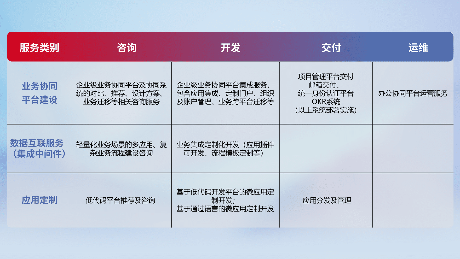 针对钉钉、、、、企微、、、、IDaas等平台级产品提供产品的规划、、、、方案、、交付、、、、定制化开发等服务,,,,实现如统一协同办公、、、、智能客户服务、、、混合会议管理、、、、智能数据查询、、、等业务场景,,实现数字化转型。。